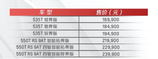那么新探界者550T RS的3款车型,分别是智能拓界版、四驱智能拓界版、四驱智能悍界版三种选项,发动机最大功率174kw(237ps),峰值扭矩350Nm,两驱版零百加速7.9秒,四驱版为8.1秒,百公里油耗在7L左右,他的最大扭矩转速区间为1500-4000转,比535T的门槛更低、持续范围更广,配合9挡手自一体变速箱,在主动升档上非常积极,而且驾驶平顺性也更加出色。底盘方面,智能拓界版为前置前驱,其余两款均为前置四驱模式,整体调校非常硬朗,但又很好的兼顾了舒适性。
