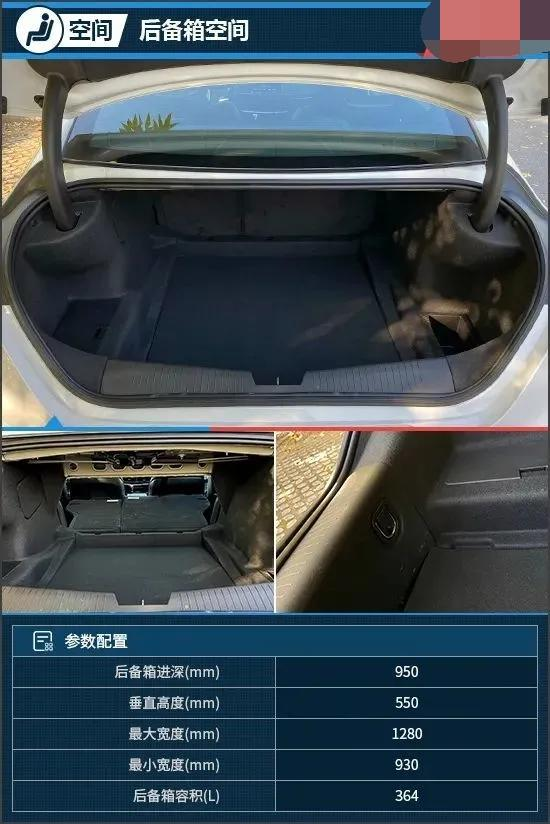 后备箱内部能够很明显的看到轮拱侵占的情况,稍有影响空间利用率。364L的后备箱容积中规中矩,不过后排座椅支持4/6比例放倒,进一步提升了扩展能力。同时,后备箱内部右侧配备了一个深度不错的储物槽,掀开地台盖板,下面还有多个容积出色的储物空间,具有很好的私密性。除此之外,在后备箱尾部边缘的左右两侧还能找到折叠式锚点,能有效辅助固定后备箱的物品,这项配置在轿车中并不常见,可见CT4有着很贴心的一面。