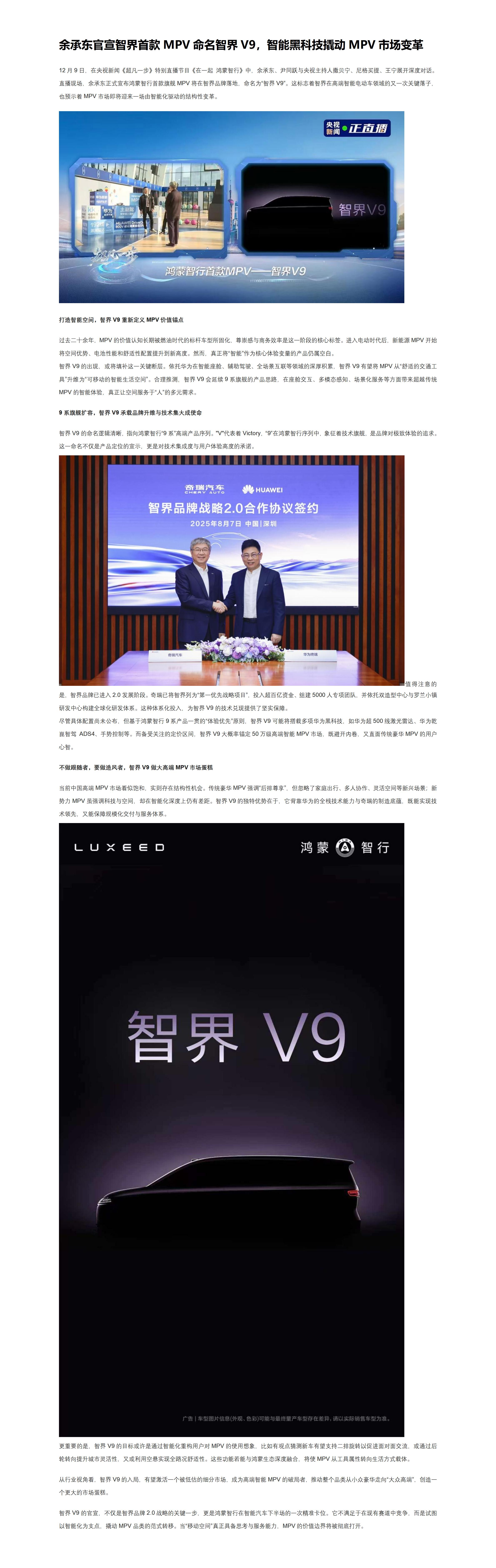 余承东官宣智界首款MPV命名智界V9,智能黑科技撬动MPV市场变革