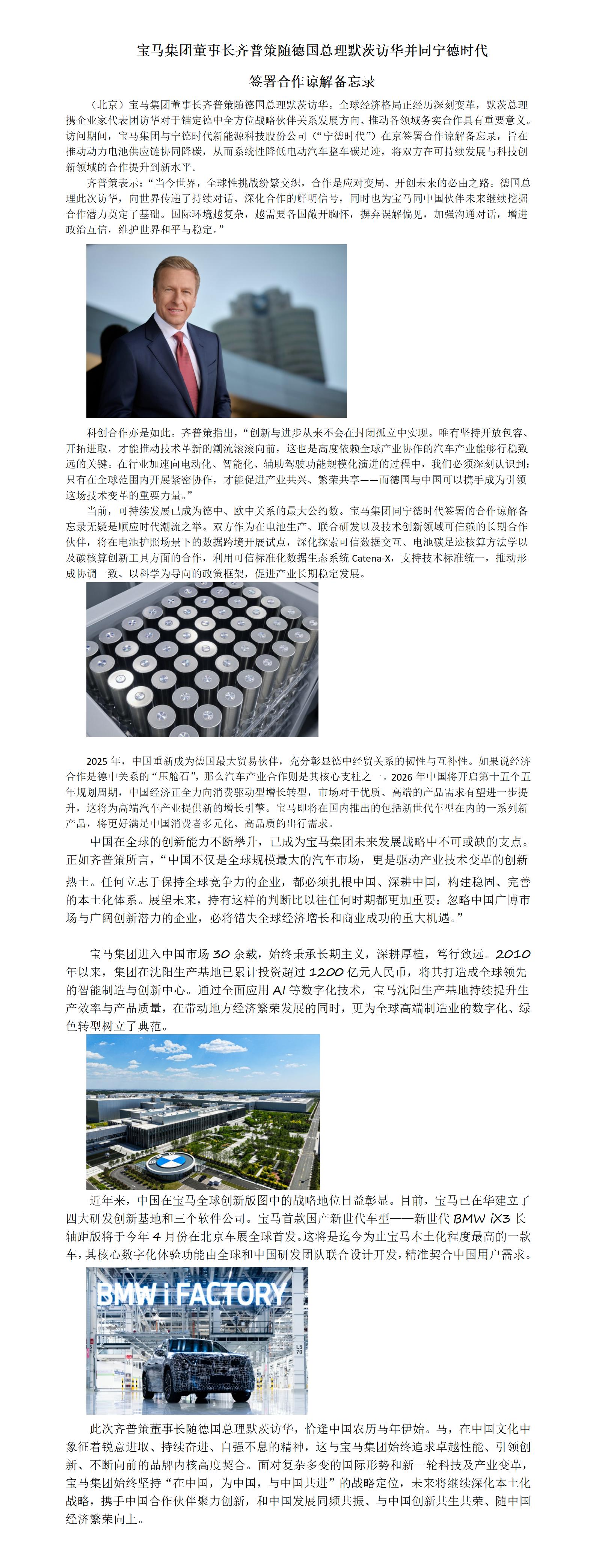 宝马集团董事长齐普策随德国总理默茨访华并同宁德时代 签署合作谅解备忘录