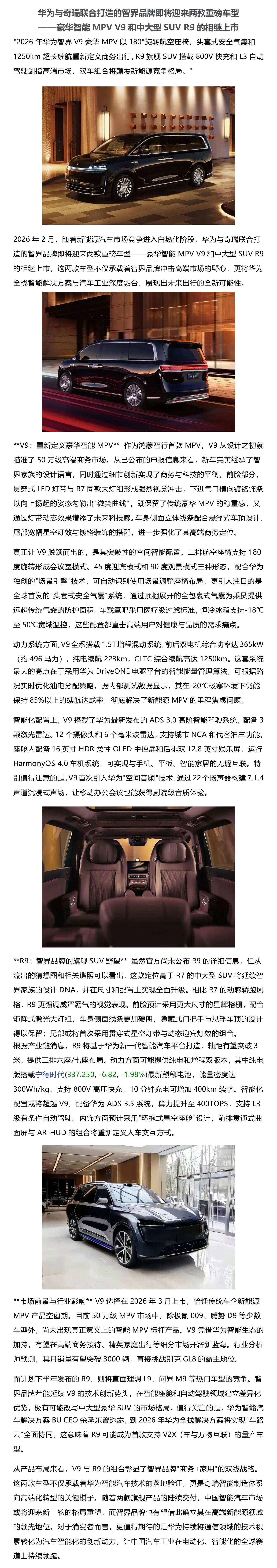 华为与奇瑞联合打造的智界品牌即将迎来两款重磅车型 ——豪华智能MPV V9和中大型SUV R9的相继上市