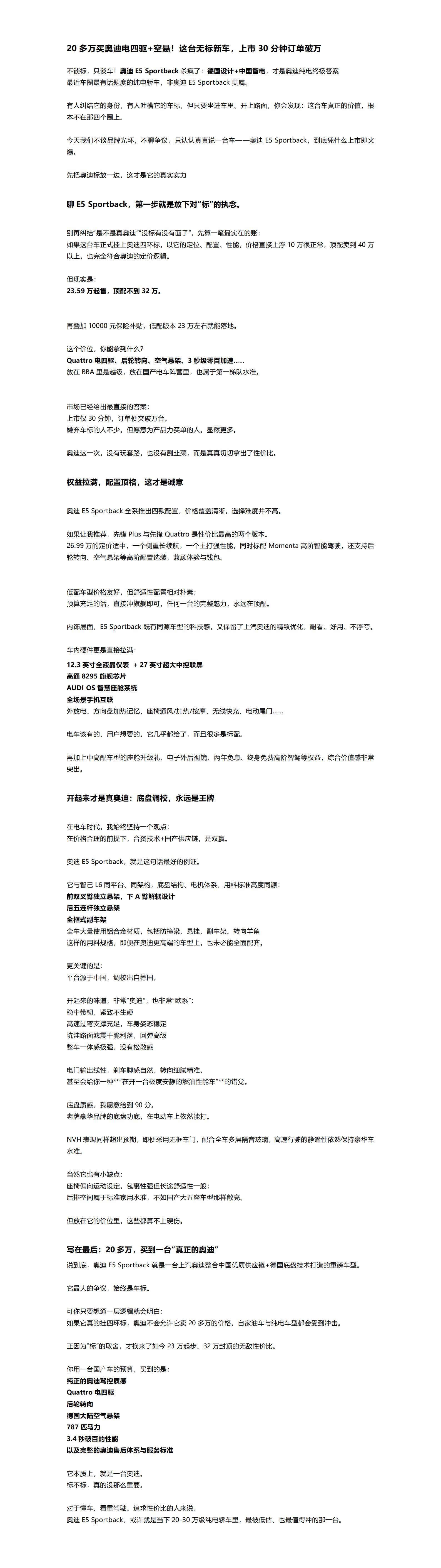 20多万买奥迪电四驱+空悬!这台无标新车,上市30分钟订单破万