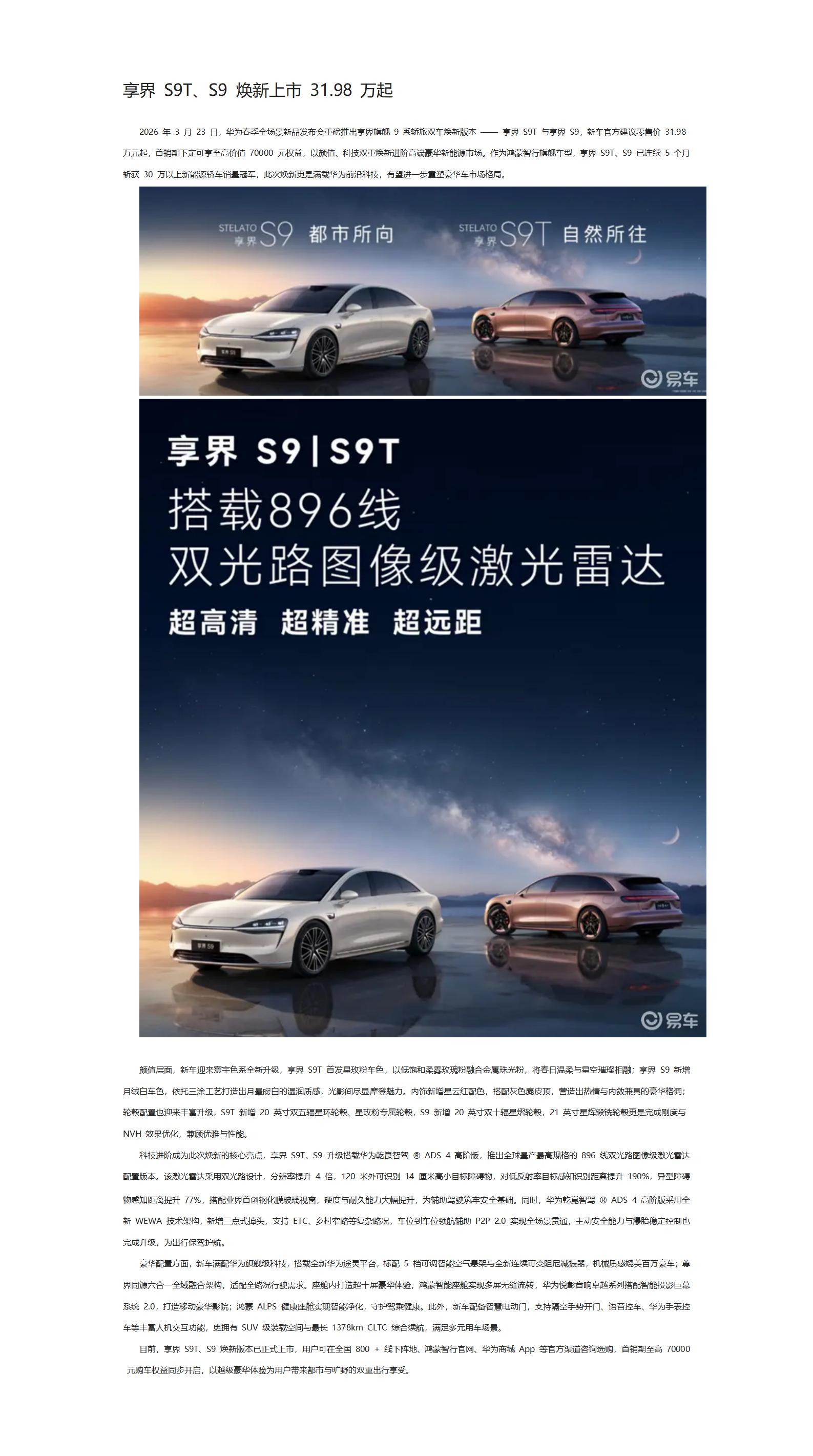 享界 S9T、S9 焕新上市 31.98 万起