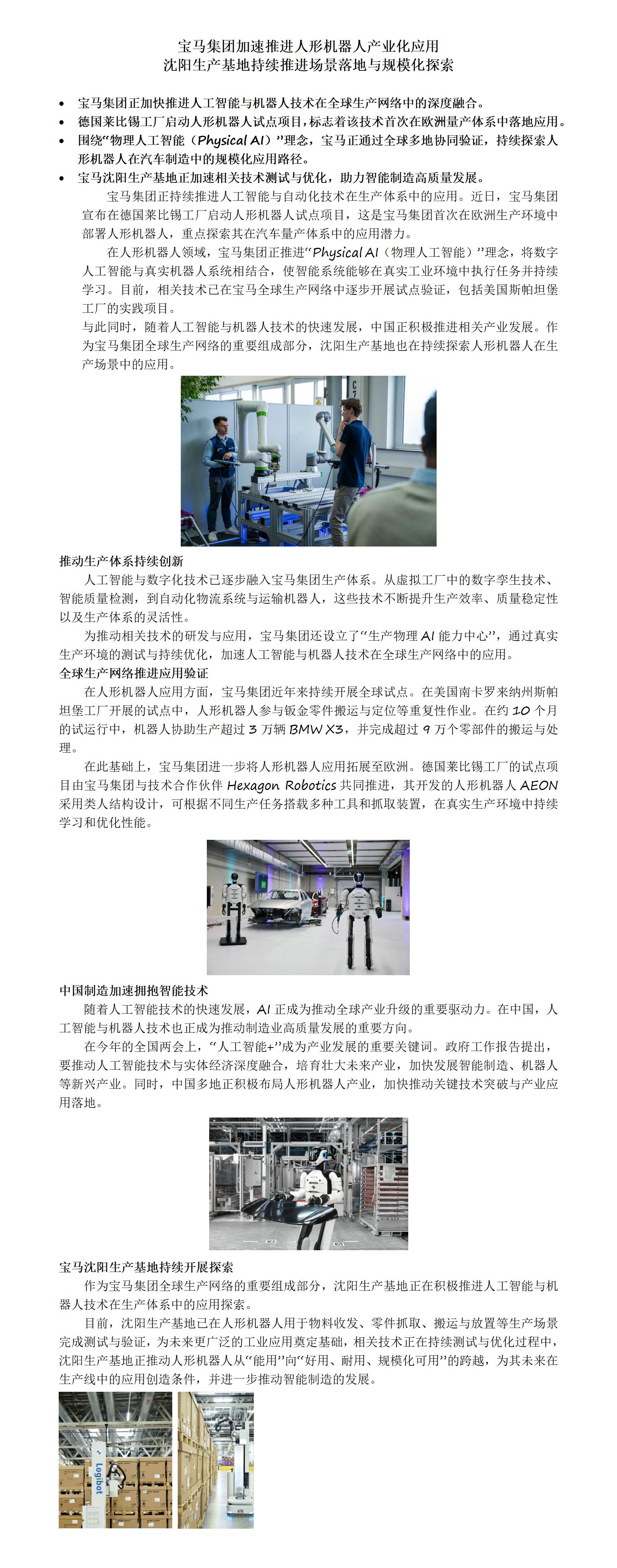 宝马集团加速推进人形机器人产业化应用 沈阳生产基地持续推进场景落地与规模化探索