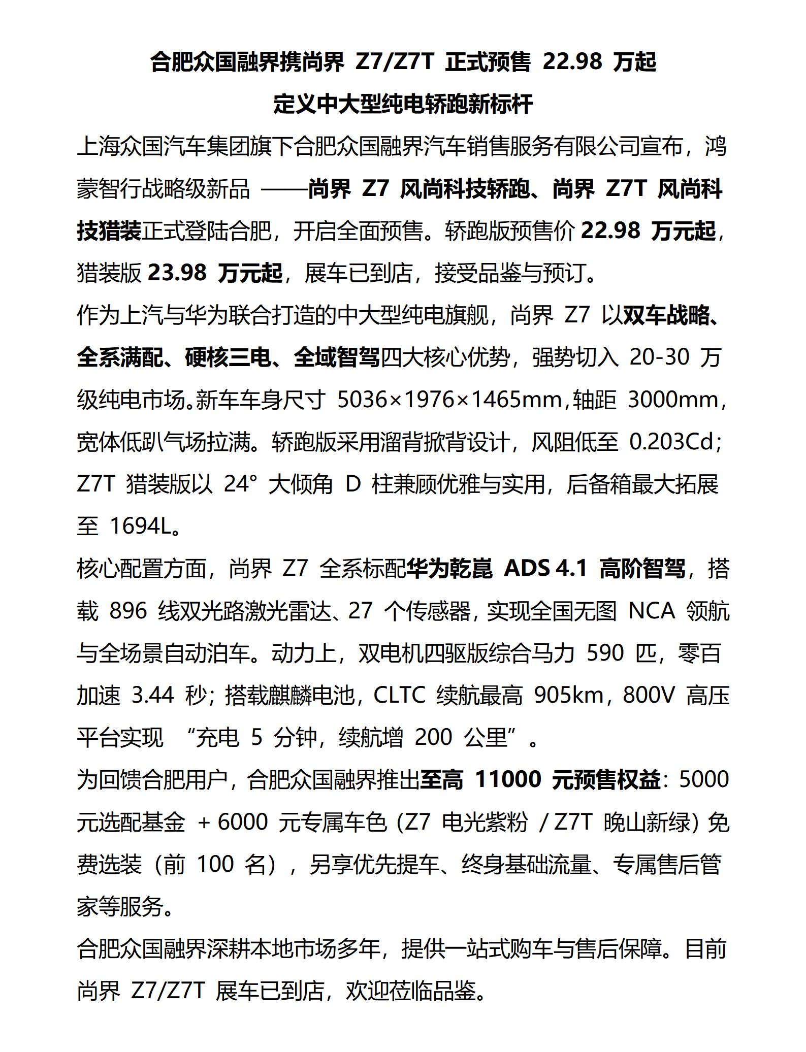 合肥众国融界携尚界 Z7/Z7T 正式预售 22.98 万起 定义中大型纯电轿跑新标杆